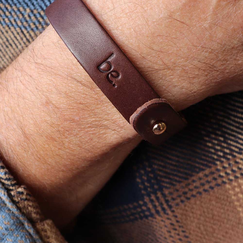 Our 5/8 inch wide, genuine leather cuff hand is stamped in our own uniquely designed font to remind you to be who God created you to be.